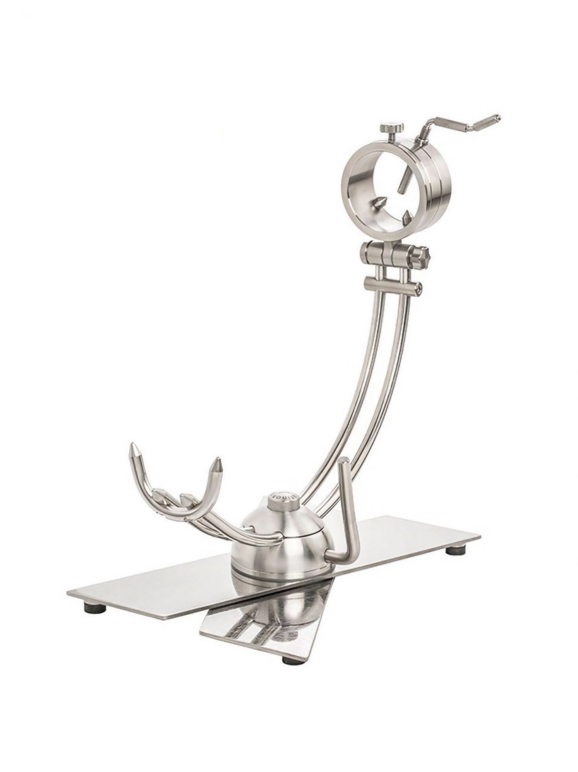 El cuerpo principal del jamonero, está construido en acero puro, siendo una herramienta de corte sólida, bella, minimalista y muy funcional, única en su género. El jamonero puede balancearse de arriba abajo para cortar el jamón o exhibirlo. El sistema de cabezal giratorio –también de acero inoxidable– permite rotar el jamón sobre su eje. El tornillo de sujeción del jamón y los puntos de agarre situados en el cabezal crean un seguro y poderoso sistema que aporta gran firmeza al corte.
